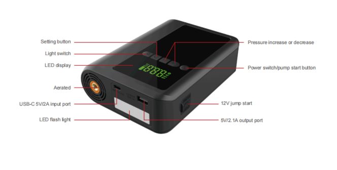 1500A jump starter with air compressor:This 1500A jump starter is known as a portable power bank and car jump starter. Charge phones, tablets, and small electronics.It’s also equipped with a buit-in air inflator and jump starter. Revive dead 12V car batteries instantly.The LCD display and switch button safely monitor the lithium battery status,while the LED light provides illumination when darkness comes.
