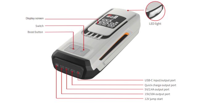 · Multi-Port Design: 2 output ports (standard charging and jump start connection)