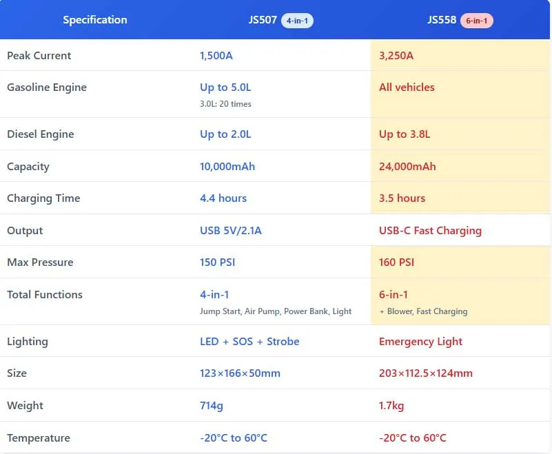 Compare 4-in-1 jump starter with air compressor vs 6-in-1 jump starter. Learn about 1500A peak current, car battery specs, jump start process, and which offers better value for money,performance and usability.