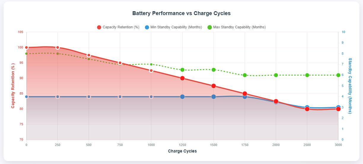 2000-3000+ cycles: 80-85% capacity retention provides 3-6 months standby capability.