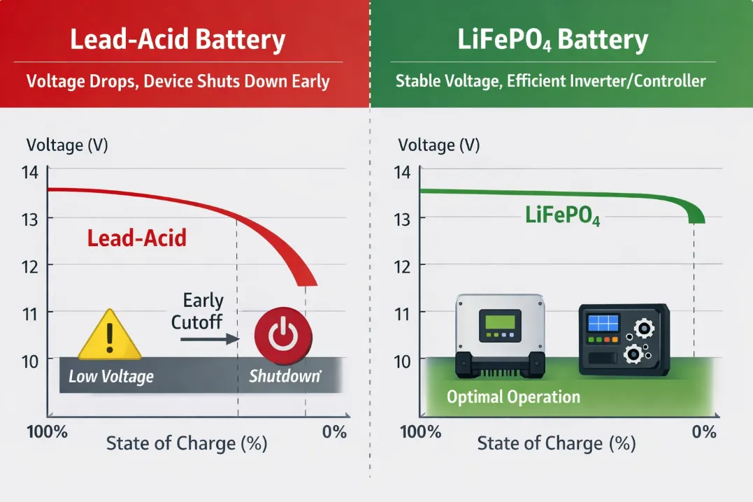 Stable Voltage Output – Lead-Acid voltage drops steadily during discharge, but LiFePO₄ maintains a flat voltage curve for most of the discharge cycle.